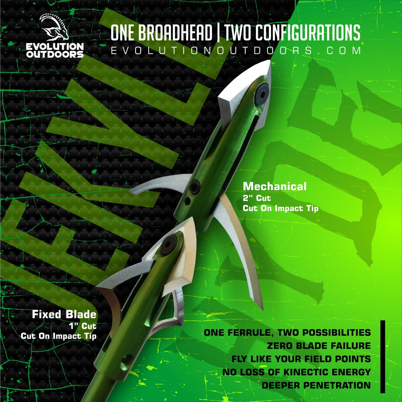 The Jekyll features a main fixed blade with a 1" diameter and a front blade with a 3/4" diameter. Both blades are fully sharpened on all sides, designed to create a devastating wound channel, especially on shots that don't result in a pass-through.